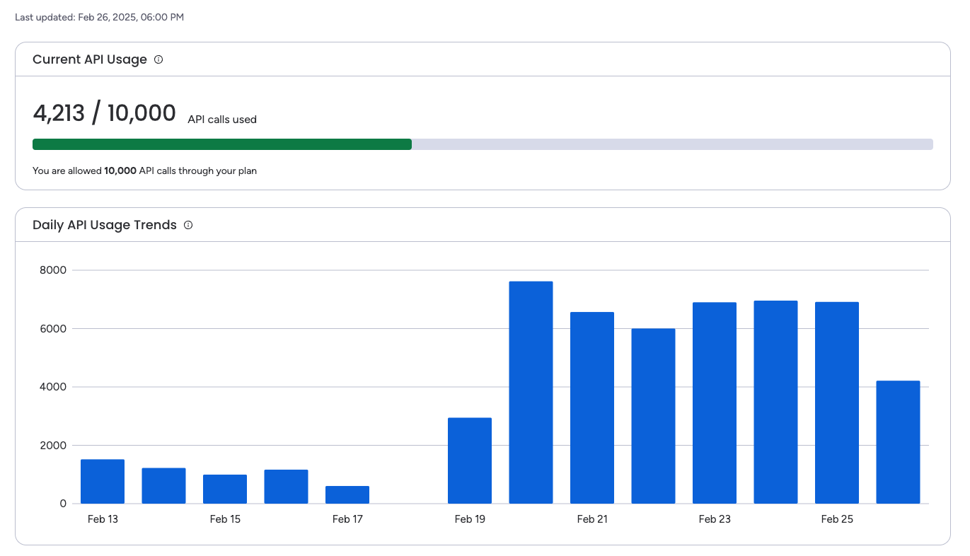 The Daily API usage trends widget tracks your account’s API usage over the past 14 days. This data provides insights into consumption patterns which can help identify trends, forecast future usage, and optimize API calls accordingly.